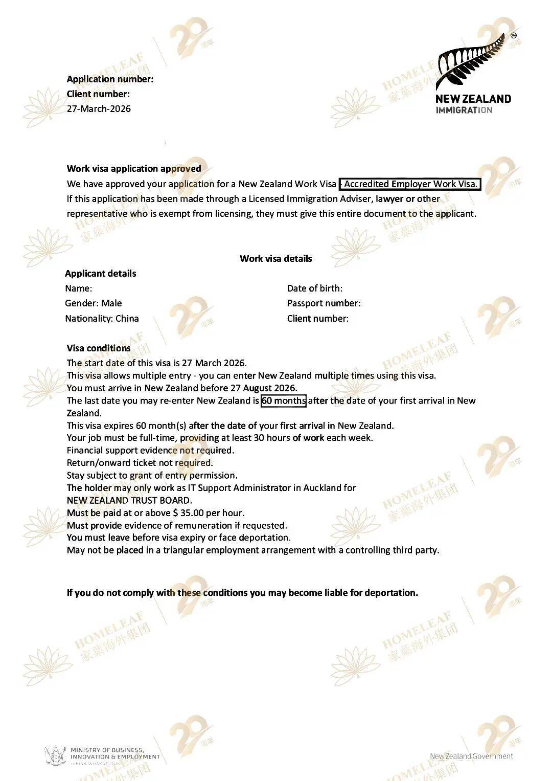 当官方公布的AEWV(雇主认证工作签证)审理周期尚在5.5周徘徊时,家叶海外团队通过对雇主资质的深度背书和申请材料的结构化处理,仅用5天便助客户拿到了5年长期工签。这不仅是时间的节约,更是对客户“时间机会成本”的极致守护。