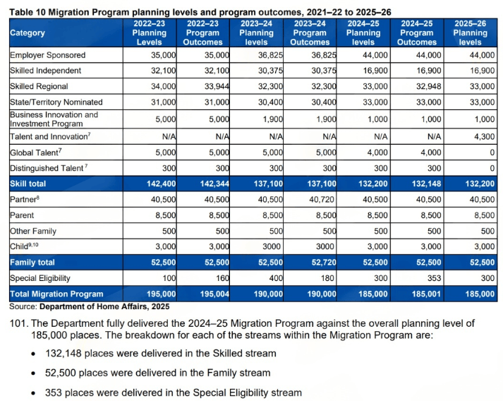 根据数据,24-25财年的澳洲移民局实际共发放185,001个移民签证,其中包含: