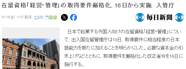 10月10日,日本出入国在留管理厅正式公布了针对外国创业者“经营・管理”在留资格的修订内容,新政策大幅提高了申请与续签门槛,旨在加强在日企业经营的真实性与持续运营能力。新规将从本月16日起实施。
