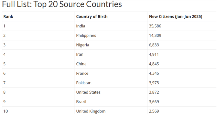 根据加拿大移民部最新公布的数据,2025年上半年印度移民以35,586人的入籍人数遥遥领先,几乎达到第二名菲律宾移民人数(14,309人)的两倍半。具体排名如下: