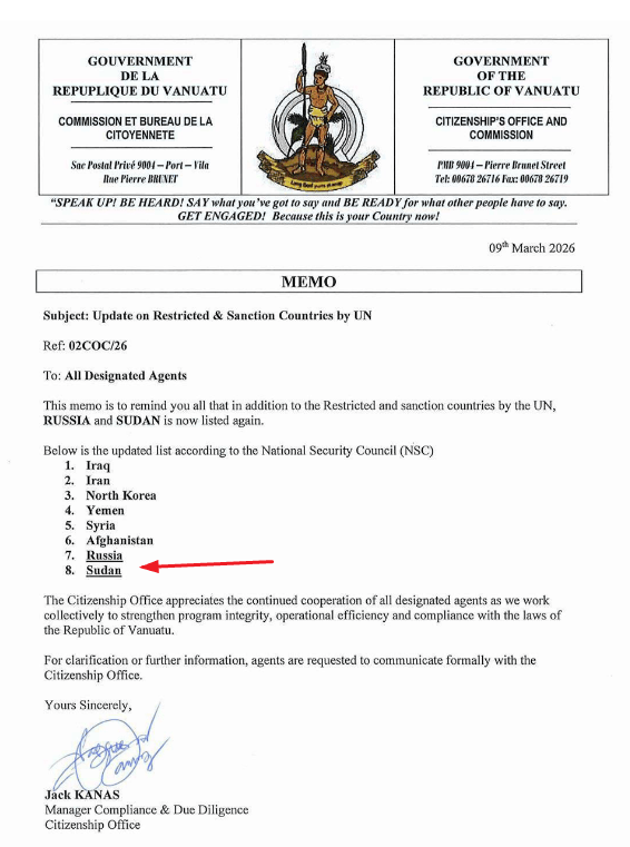 根据2026年3月9日瓦努阿图公民身份办公室发布的最新内部备忘录(编号:02COC/26),该国投资入籍计划(CBI)的受限名单已正式扩容至8国。这一变动不仅关上了俄罗斯与苏丹申请人的大门,更释放了全球身份规划逻辑重构的强烈信号。