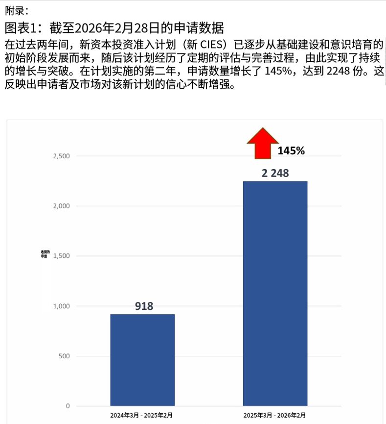 根据港府最新数据,新政实施以来,申请量已呈指数级增长。截至2026年2月28日,香港投资推广署已接获3166宗申请,1762宗完成投资并获正式批准,预计带来投资额950亿港元。