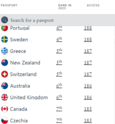 葡萄牙护照也具有显著优势,在公民身份与流动性方面评分为95.3%。持葡萄牙护照可免签通行包括美国、加拿大、澳大利亚在内的188个国家和地区,并可在欧盟27国自由定居,享受与当地居民同等的工作、教育及医疗等待遇。