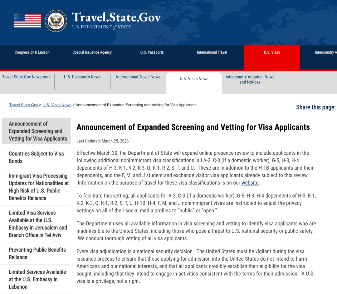 2026年3月25日,美国国务院(DOS)正式宣布:自3月30日起,针对14类非移民签证(NIV)的社交媒体审查新规全面生效。这并非简单的表格加项,而是从“主动申报”到“强制公开”的规则质变——申请人过去五年在互联网上的所有公开行为,都将被领事官员与AI审核系统纳入显微镜下。