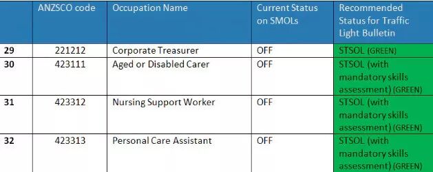 上图黄色部分是预计将在列表间调动的职业依次是:汽车电工、摩托车技工、锁匠、商业油漆工、玻璃工、墙壁和地面瓷砖工、家具木工、邮局经理、机械工程制图员、房产代表、地质学家、销售市场经理、ICT项目经理(包括区块链规划师/经理)、其他未分类职业信息规划师(包括数据科学家)、保险理赔员、采购经理、船长;