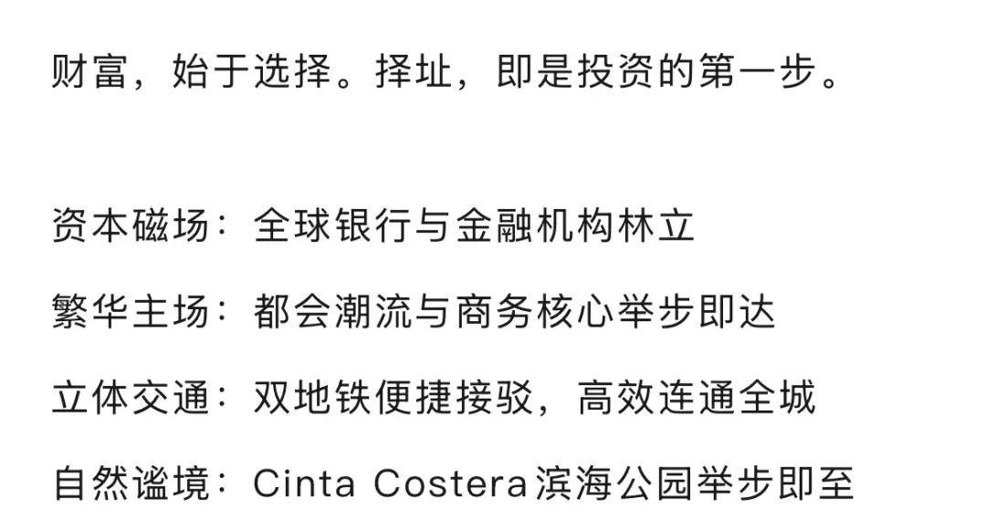 登临金融街,入住顶流席 金融街壹号,雄踞巴拿马城C50金融街核心。这里不仅是国家经济命脉所系,更是全球银行与金融机构的总部聚集地。在这里,资本与信息交汇,机遇与价值共生。 银行总部云集 卡门双地铁站330米(1号线运营中,2号线规划中) 万豪行政酒店公寓230米 | W酒店250米 希尔顿酒店540米 | 悦宜湾酒店660米 Cinta Costera滨海公园540米 巴拿马大学800米 | SOHO Mall 960米 | F&F Tower 1公里 露天泳池、顶级健身房、共享办公、私人会议室、烧烤区与酒吧区……这里不仅是居所,更是匹配您身份与视野的社交主场。 样板间展示