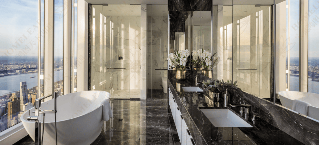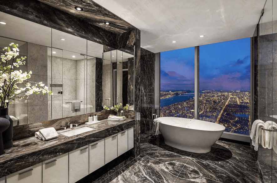 浴室则采用了高档石材和豪华卫浴设施,为住户提供类似水疗的放松体验。浴室墙面和地面铺设了Calacatta或Statuario进口大理石,具有防水防潮处理,确保耐用性和美观性。五金件均来自Dornbracht或Hansgrohe,采用了高端材质,确保长久使用和卓越的操作体验。