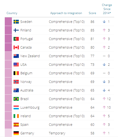 根据最新排名,瑞典的移民融合度得分最高,总体得分为86分。芬兰以85分排在第二。而葡萄牙以81分的好成绩位居第三。