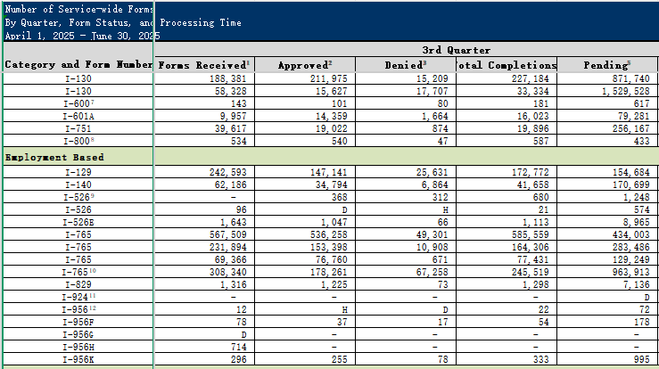 这也使得“隐形排期”问题进一步加剧。数据显示,25财年截至第三季度,共计有8965份526E申请正在等待审批。尽管签证公告尚未显示排期,但在审批和签证签发环节,积压的申请已然排起了长队。