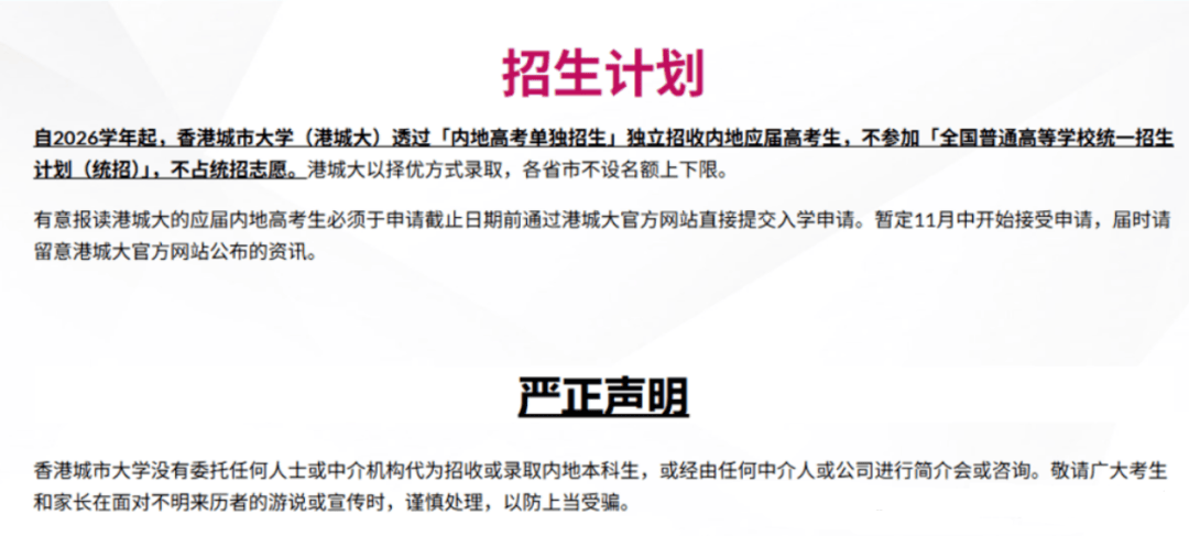 这就是说,自 2026学年起,香港城市大学(港城大)通过「内地高考单独招生」独立招收内地应届高考生,不参加「全国普通高等学校统一招生计划(统招)」,不占统招志愿。