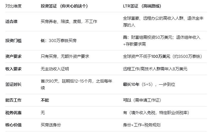 很多高净值人士听说泰国有个LTR签证,可以拿10年,还免税。没错,但那是另一条路。我给你列个表,一看就懂: