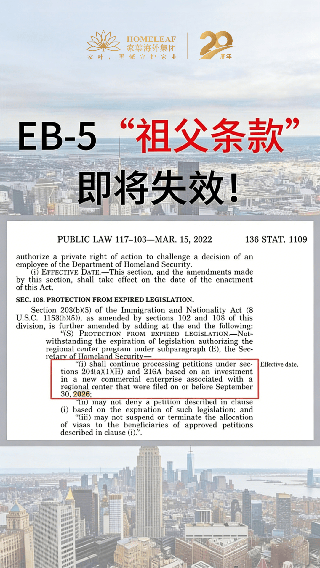 变局将至:2026年9月30日,美国EB-5“祖父条款”将到期!