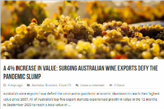 2020-12-09最新数据,澳大利亚葡萄酒的出口抵御住疫情影响,在包括中国的每个主要出口市场销售增加的推动下,其出口价值跃升了4%,达到近30亿澳元。截至9月份的过去12个月中,澳大利亚葡萄酒出口总额达到29.98亿,在前五大出口市场的每个国家都实现了增长。一、澳大利亚···