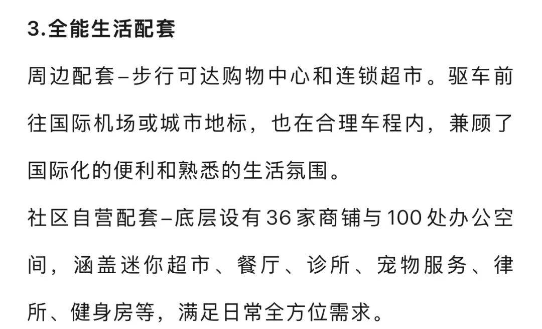 楼内配套:露天泳池、健身房、足球场、篮球场、儿童活动区、共享办公区、游戏室、宠物活动区、酒吧区、烧烤区、活动大厅、屋顶露台