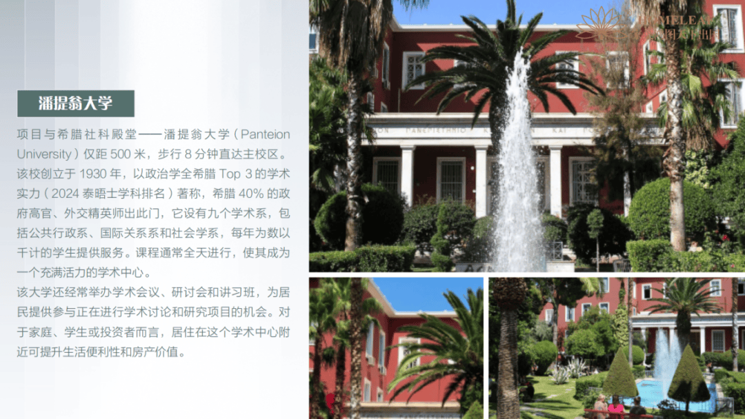 项 目 与 希 腊 社 科 殿 堂 —— 潘 提 翁 大 学(Panteion University)仅距 500 米,步行 8 分钟直达主校区。该校创立于 1930 年,以政治学全希腊 Top 3 的学术实力(2024 泰晤士学科排名)著称,希腊 40% 的政府高官、外交精英师出此门,它设有九个学术系,包括公共行政系、国际关系系和社会学系,每年为数以千计的学生提供服务。课程通常全天进行,使其成为一个充满活力的学术中心。